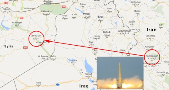The Zolfaqar missiles used have a range of 700 km (430 miles). They were launched from western Iran, and came down on Deir-ez Zor, a town in eastern Syria.