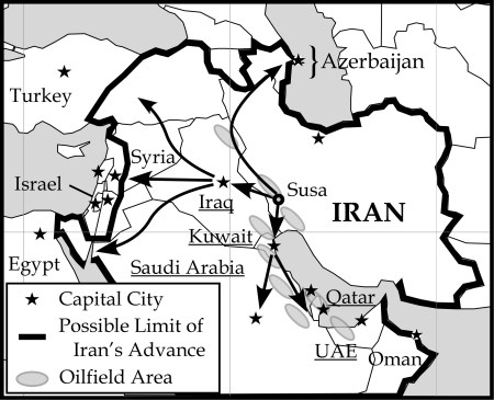 The Second Signpost is the second of four sets of events prior to the Tribulation, told to us by the Bible. This Second Signpost is the escalation of war in the Middle East. Iranian military forces will run out from country to country installing Islamic revolution, causing chaos, and taking control of the oilfields which provide one quarter of the oil supply to the world. The bear of Daniel 7, the ram of Daniel 8, and the second horseman of Revelation talk of this, and the events within the government and society of Iran confirm that the time is ripe. The affected oilfields are almost entirely in only six nations – Iran itself, Iraq, Saudi Arabia, and the Gulf states of Kuwait, Qatar, and the U.A.E. All are within easy striking range of Iran’s offensive move. The map shows the location of the oilfields in relation to Iran and its advances.