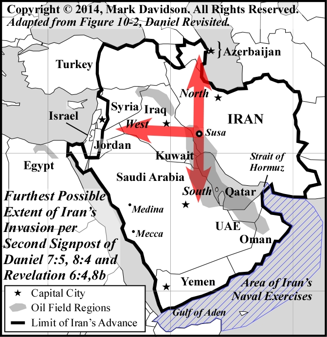 This news story reports that Iran was to begin its largest navy exercise in the history of the Islamic Republic. The exercise will extend from the Strait of Hormuz south into the Indian Ocean and west to the Gulf of Aden. This area of ocean is roughly the size of Saudi Arabia. The potential areas where the exercises will take place are shown on the map, just off the coast of the Arabian Peninsula which could see Iran’s occupation during the Second Signpost. (Note: The red arrows represent the directions the Persian ram would run out from Susa, in Daniel 8.)
