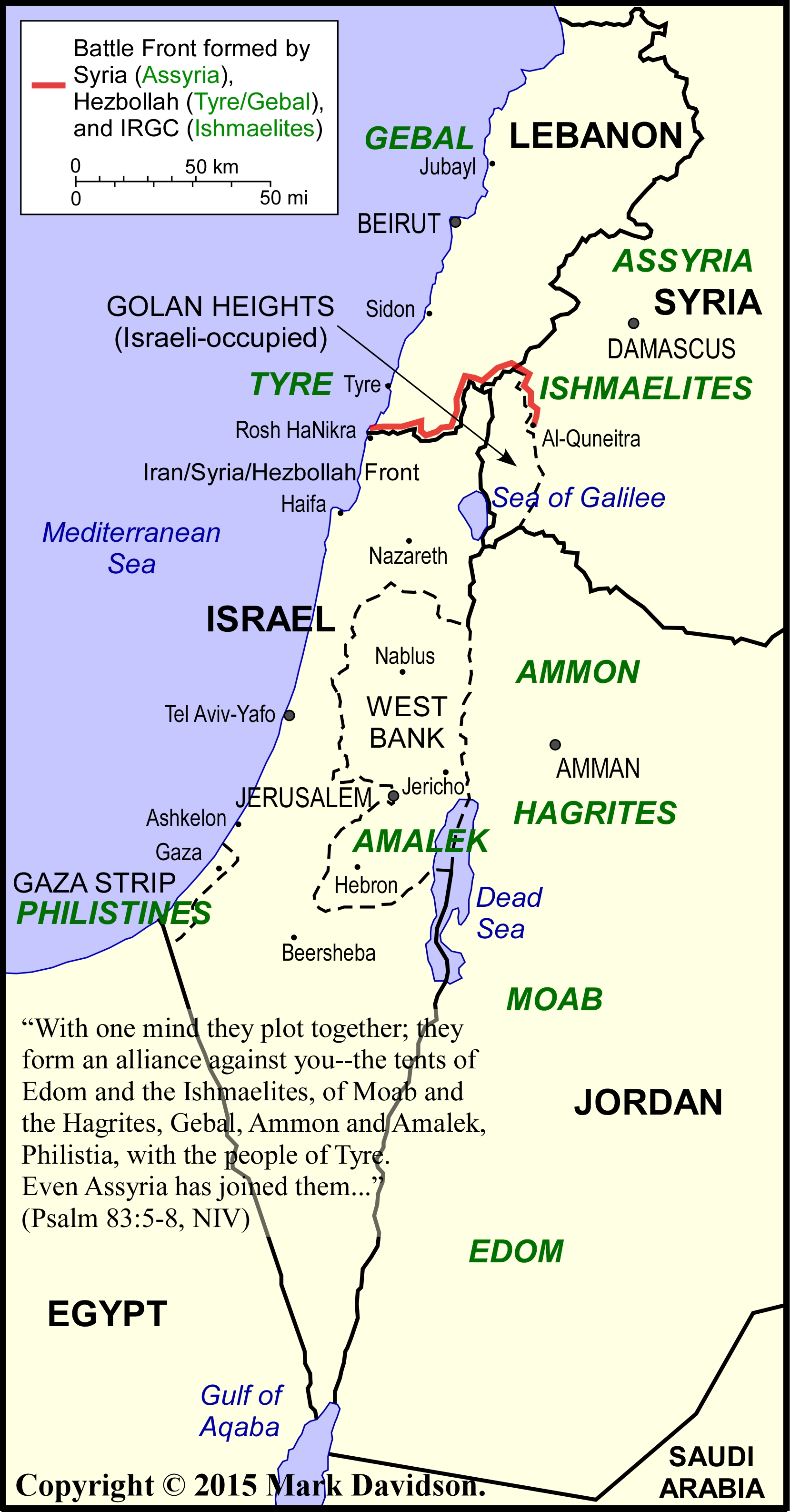 Iran has indeed proven its place as master coordinator for much of the list of peoples. Iran’s alliance with the likewise Shia Muslim group, Hezbollah, has been going on solidly since 1982. Iran’s militia the Basij (part of Iran’s IRGC), Hezbollah, and the Syrian army under Assad all have access throughout much of Lebanon and in the non-ISIS areas of Syria. The first news story is from MEMRI and presents a great threat to Israel’s security. It reports that the Iranian IRGC (i.e., Ishmaelites), the Syrian army under Assad (Assyrians) lending their strength, and Hezbollah (Tyre and Gebal) all acted together and conspired to clear the Syrian rebels from the Syrian side of the border in the Golan Heights. This allows the three powers to present one unified front against Israel, from Rosh HaNikra to Al-Quneitra (see red line on map). No longer does Israel face Hezbollah by itself in Lebanon and Assad’s armies by themselves in Syria, but now Israel faces a unified and coordinated force backed by direct involvement of the IRGC.