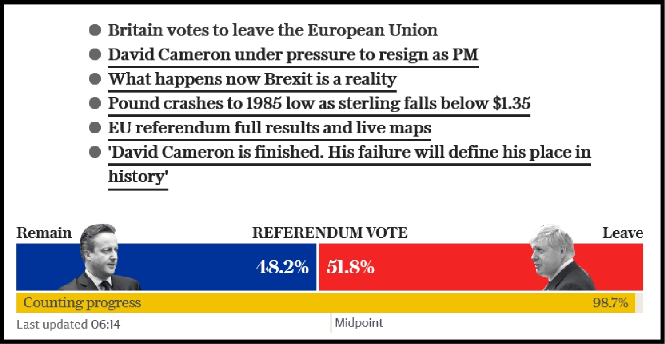 It’s late here in the Mountain Time Zone, but I thought I’d check the news one more time. This is a follow-up to the last post. The Leave vote beat the Remain vote. Brexit wins! The stories are here and here.