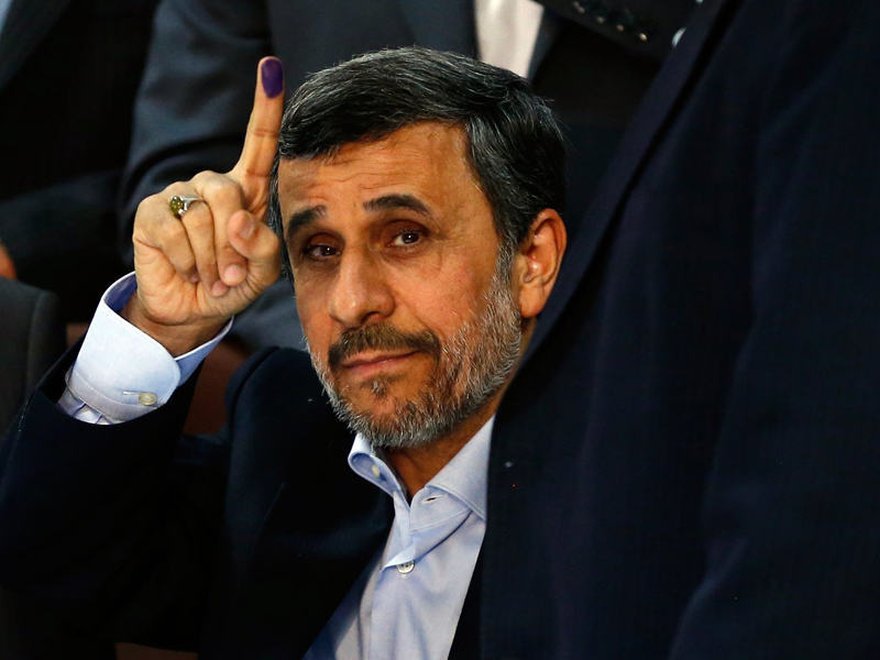 Former Iranian President Mahmoud Ahmadinejad shows his inked finger after registering his candidacy in Tehran, Iran, 12 April 2017. EPA/ABEDIN TAHERKENAREH