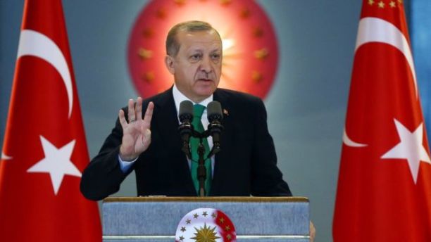 Turkish President Erdoğan arguing for sweeping constitutional changes, photographed like a supreme leader of a revived Turkish empire. (Side note: All four colors of the Revelation horses are visible in the photo, while he shows us how many Signposts there are.)