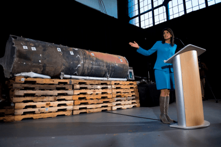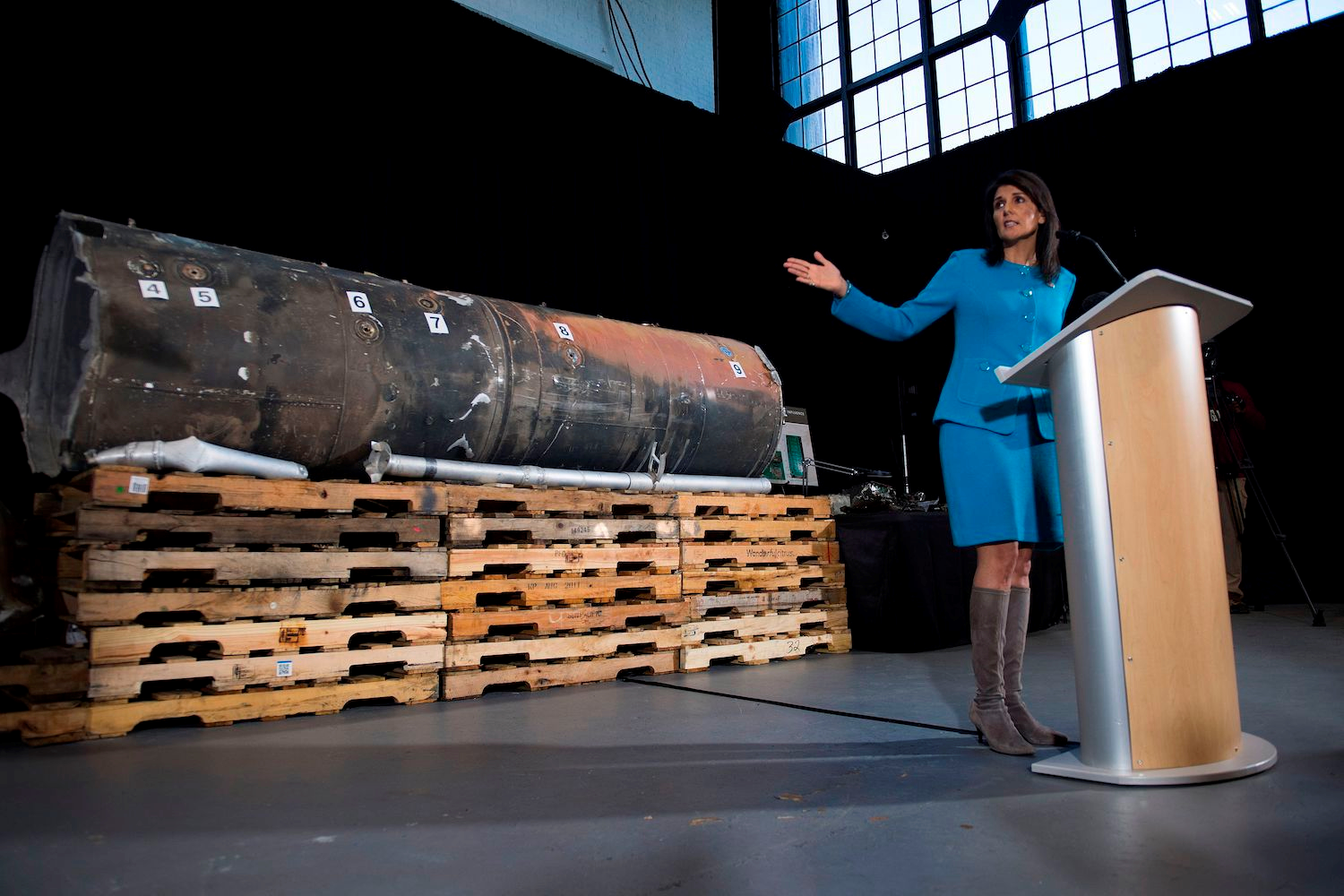 US Ambassador to the UN, Nikki Haley, describes evidence against Iran. Behind her is a piece of a missile launched by the Houthis into Arabia, with Iranian markings on it.