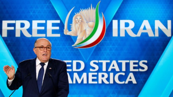 Former NYC mayor Rudy Giuliani speaks at the NCRI conference near Paris in June 2018. Note the “Free Iran” next to the name of the traditionally powerful nation that will deal with it.
