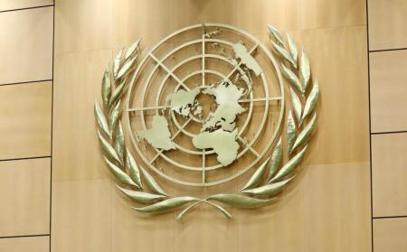 The United Nations emblem in Geneva, Switzerland. All three parts of the world start in the center (North Pole) and roll out southwards, in directions of a clock face at 2, 5, and 8 o’clock. (REUTERS File Photo)