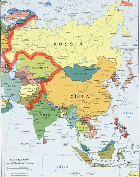 A map of East Earth, which contains China, India, Russia, Australia and Southeast Asia. The borders with Center Earth and West Earth are marked in red.
