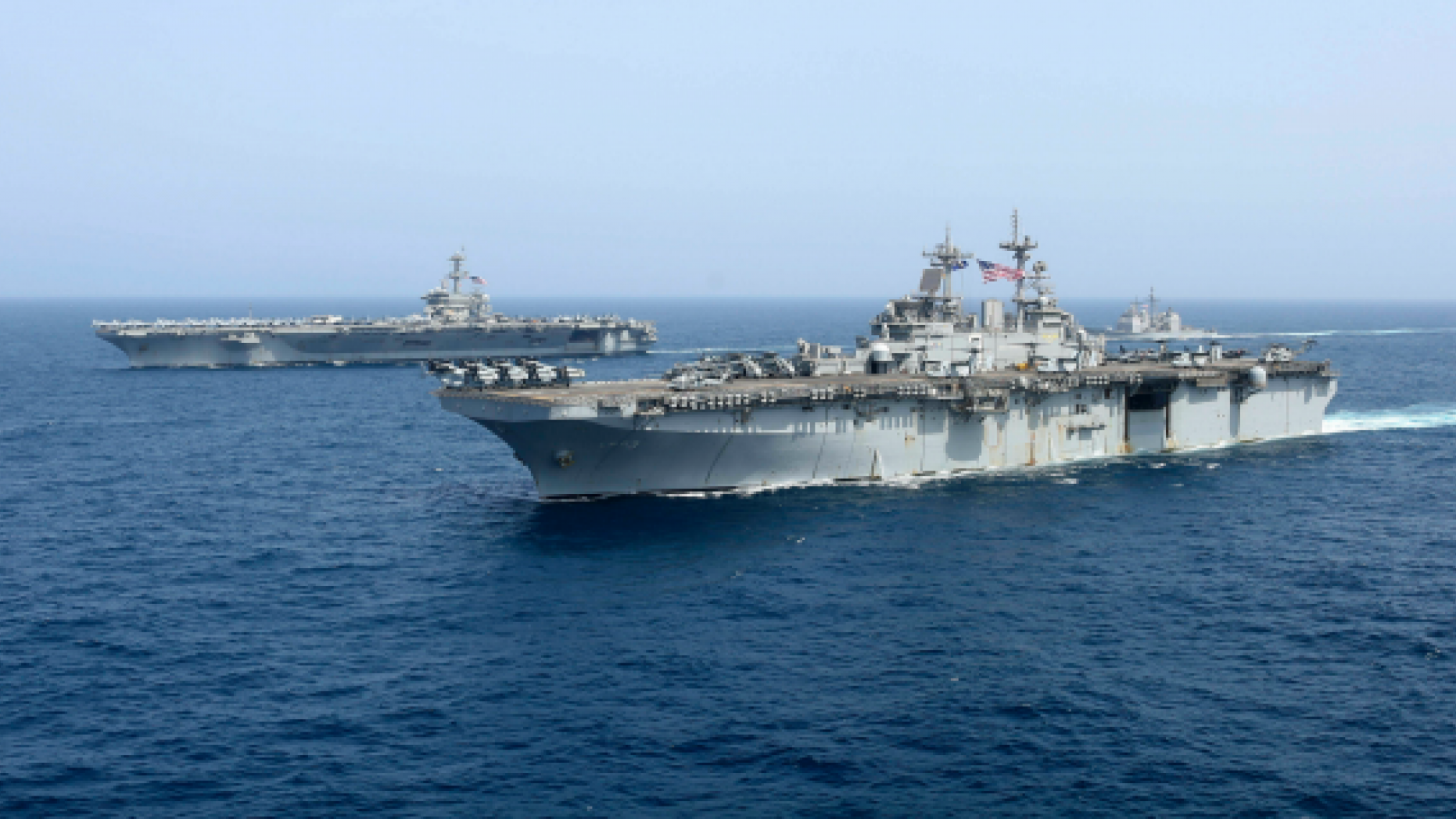 The USS Kearsarge in the foreground with the USS Abraham Lincoln in the background, on May 17, 2019.