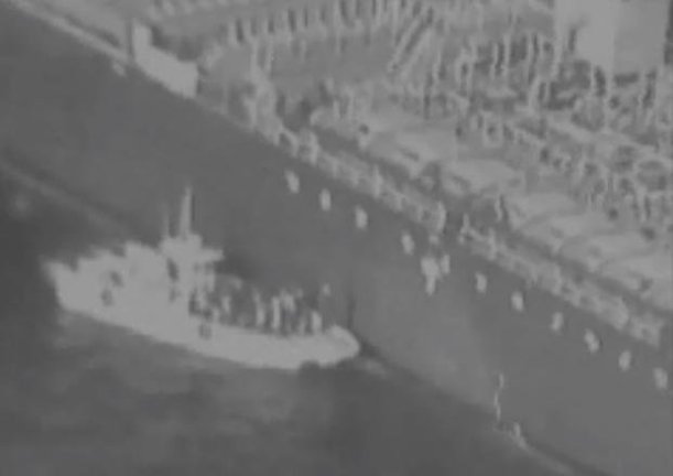 Screen grab from a released CENTCOM video. It shows what is believed to be an Iranian small vessel removing an unexploded mine from the hull of an oil tanker. This is being used as evidence of Iran’s involvement in the tanker attacks.