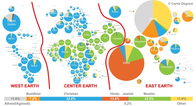 So there we have it. West Earth is almost solid blue and is free to pursue Christ or not. Center Earth is losing their Christian faith, falling away to Islam or the Enlightenment. East Earth is inoculated from Christianity with a mixture of faiths. This last part of the earth, with half of the human population, is the part of the earth that has potentially the greatest harvest in the end times.