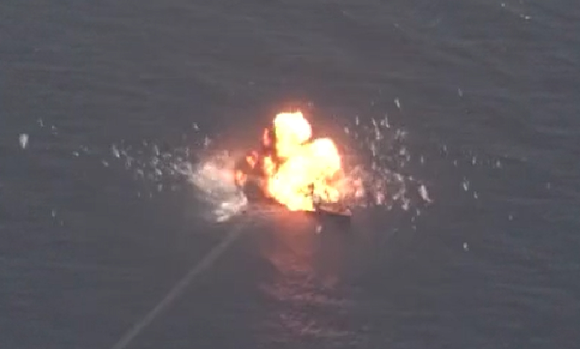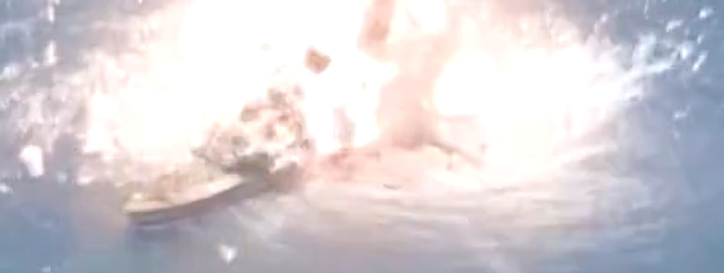 Screen grab from Iranian news video of mock ship being struck. The cruise missile trail can be seen in the lower left hand part of the screen.