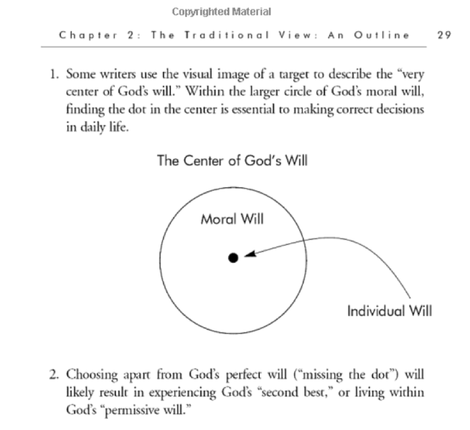 What is central is the illustration from page 29, shown below. You see a circle. Outside the circle is God’s sovereign will. The circle and its contents is God’s moral will. The dot is God’s supposed individual will for our lives.