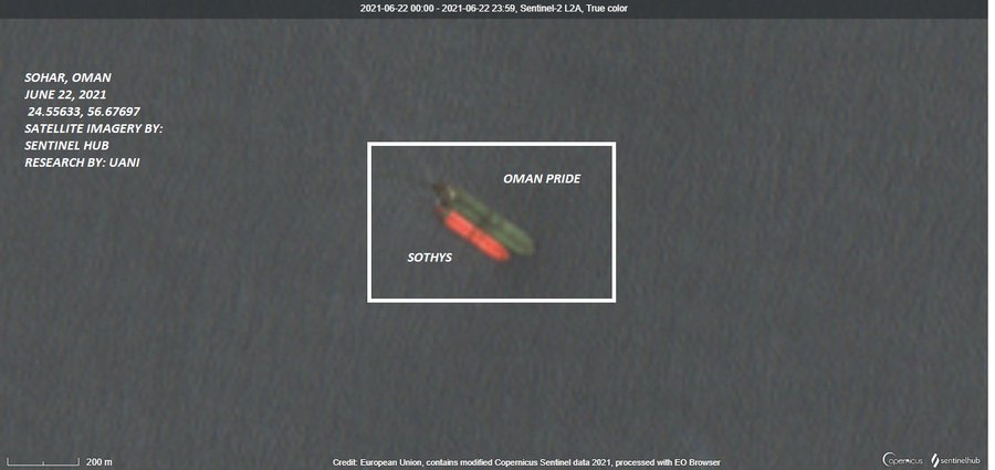 To bypass U.S. sanctions against accepting oil from Iran, Iran has found ways to sneak it into China. A satellite image taken June 22, 2021, over the Gulf of Oman shows the larger green-decked Oman Pride (Liberia flag) transferring oil to the smaller red-decked Sothys (Viet Nam flag).