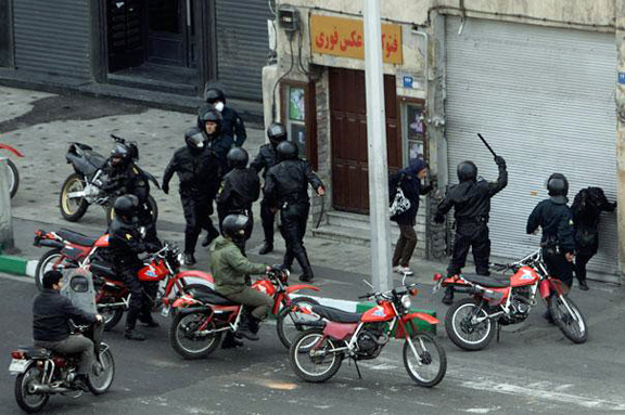 A common sight in the 2009 election: Basij paramilitary getting off their fiery red motorcycles to beat up another protester. The “morality police” have been ordered to stand down.