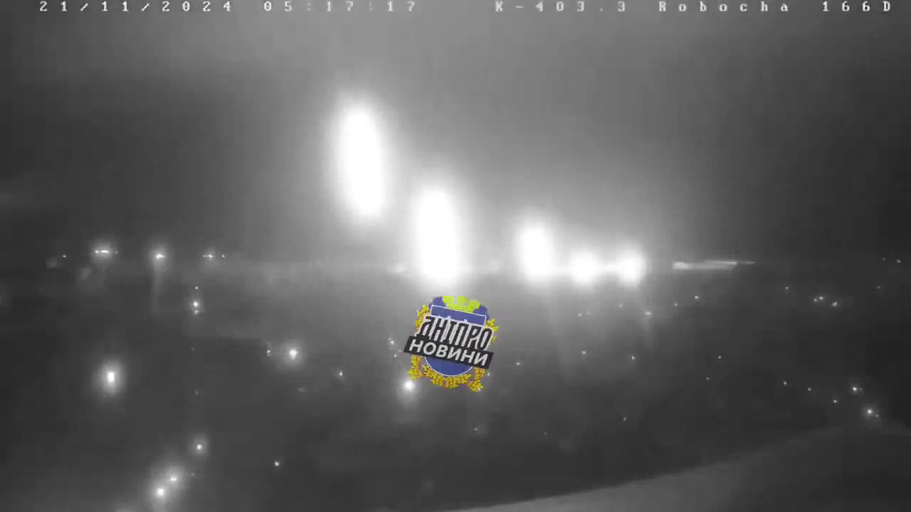 Screenshot of video showing last five MIRVs, of the one ICBM, striking targets in Dnipro, the morning of November 21, 2024. The “fireballs” are the trails of the MIRV flight paths.
