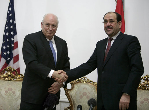 Mission accomplished: VP Cheney shakes hands with Maliki, the new Prime Minister of Iraq in March 2008, with the lion having had its mind changed.