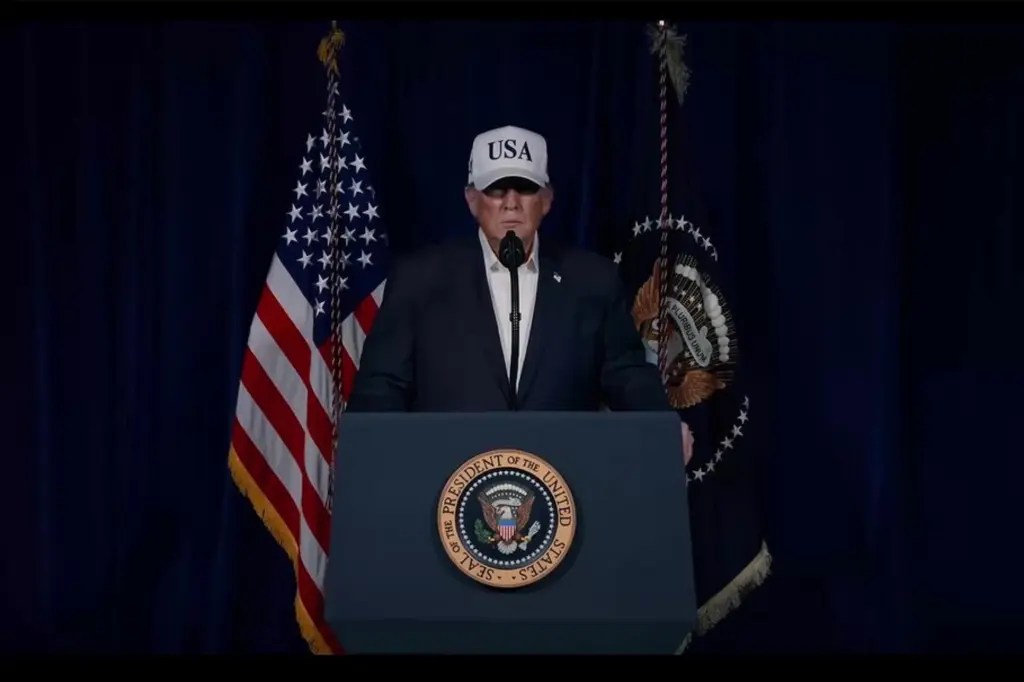 (28 February 2026) Wearing a baseball cap (this one displaying “USA”), as President Trump does on many occasions, he gave the same speech this morning as George W Bush gave in February 2003.