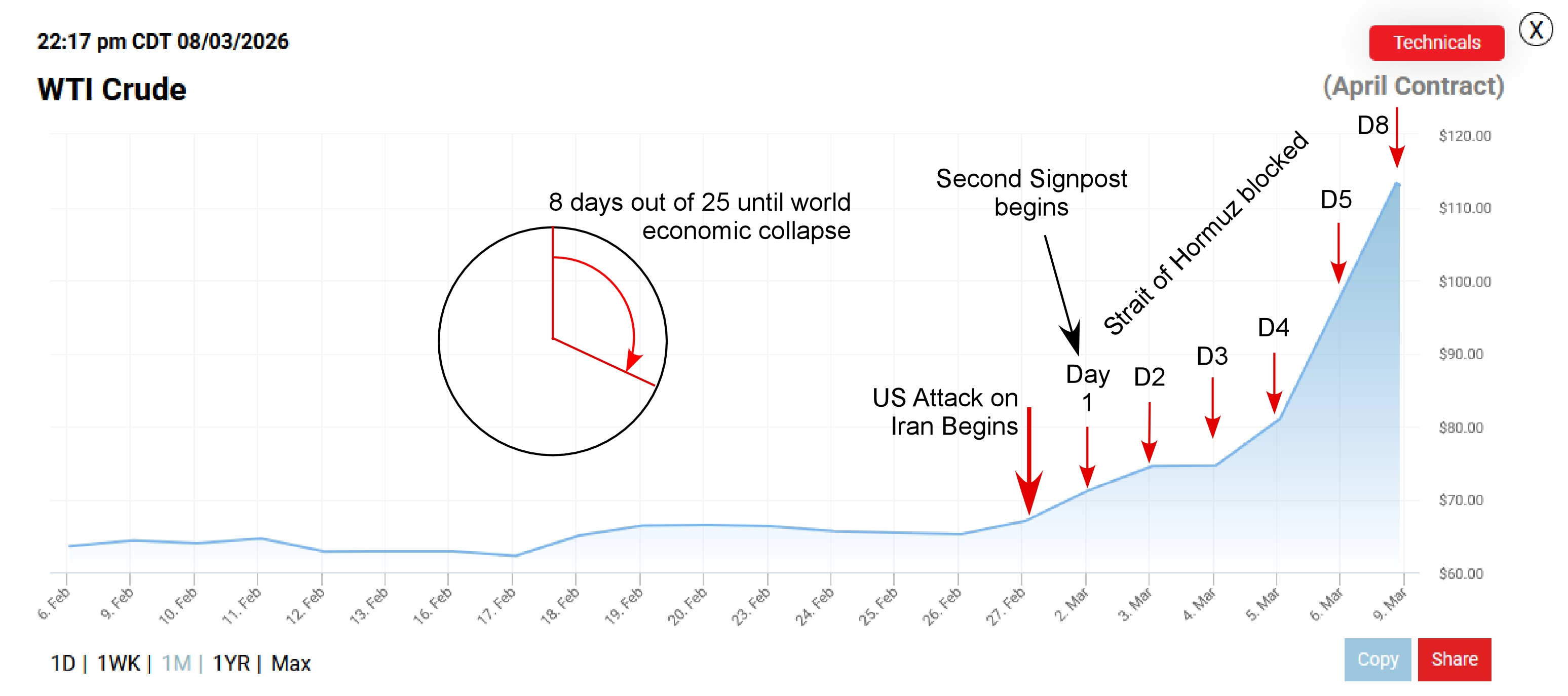 (8 March 2026) I will keep a watch on the WTI price and the Strait of Hormuz over the next 25 days, or until the block is ended. The Second Signpost may have begun March 2.