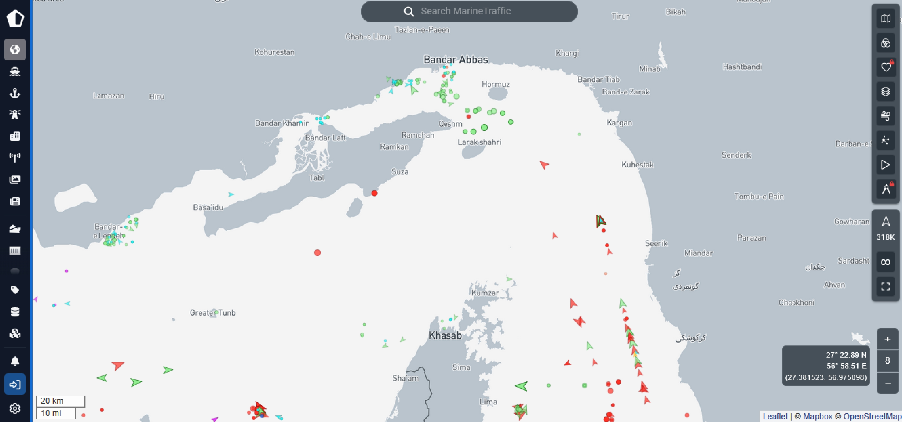 Ship traffic through Strait of Hormuz at 4 pm GMT, March 11, 2026. Note single file parade of oil tankers and cargo ships in the line furthest east, heading north, heading in.