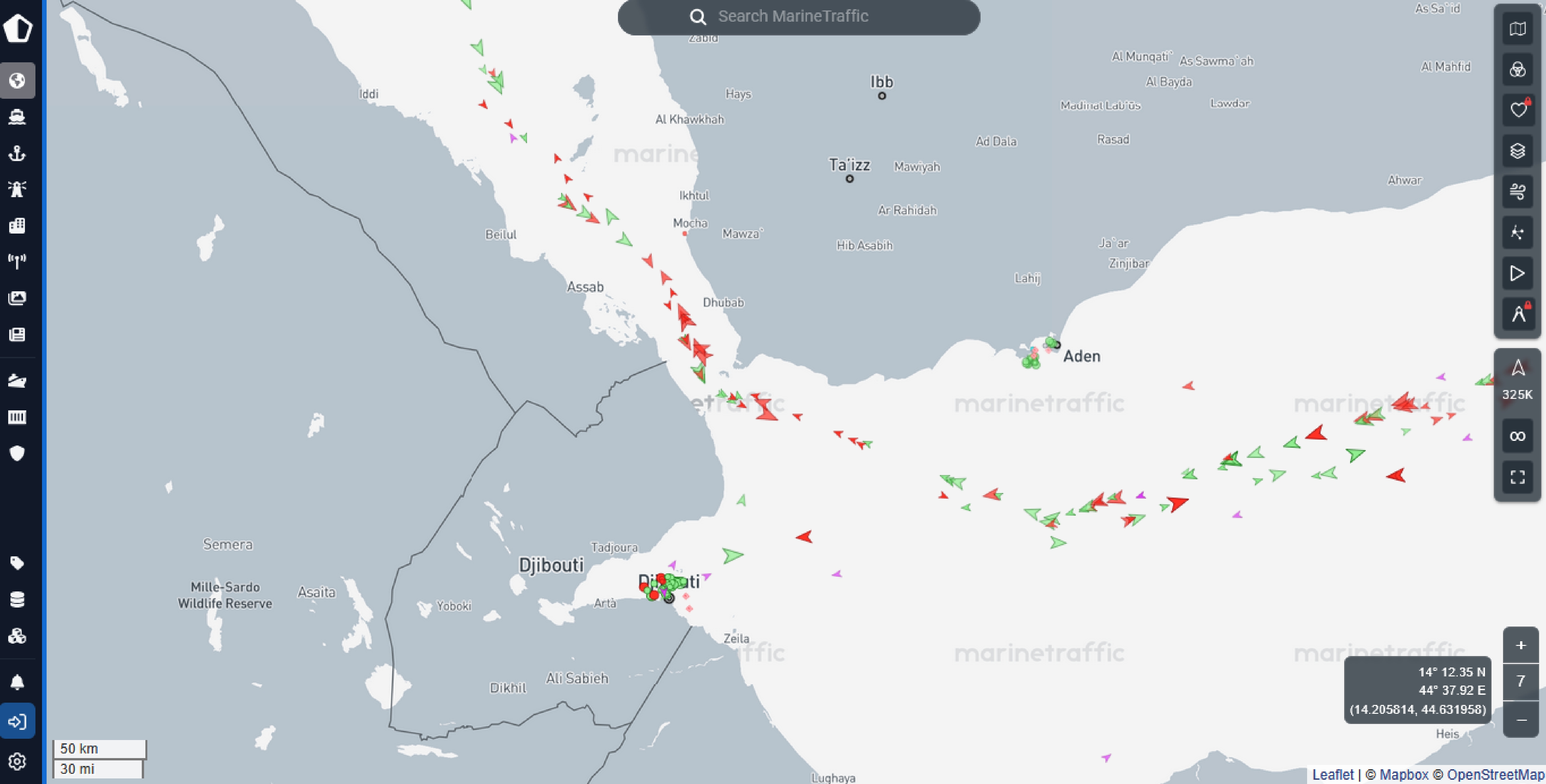 Oil tanker traffic through Gulf of Aden on March 15, 2026. From marinetraffic.com.