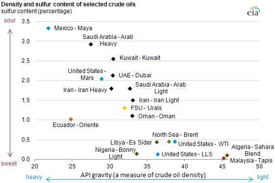 A chart comparing flavor and density of various crude oils. WTI and Dubai are benchmarks for price of sweet and sour, respectively.
