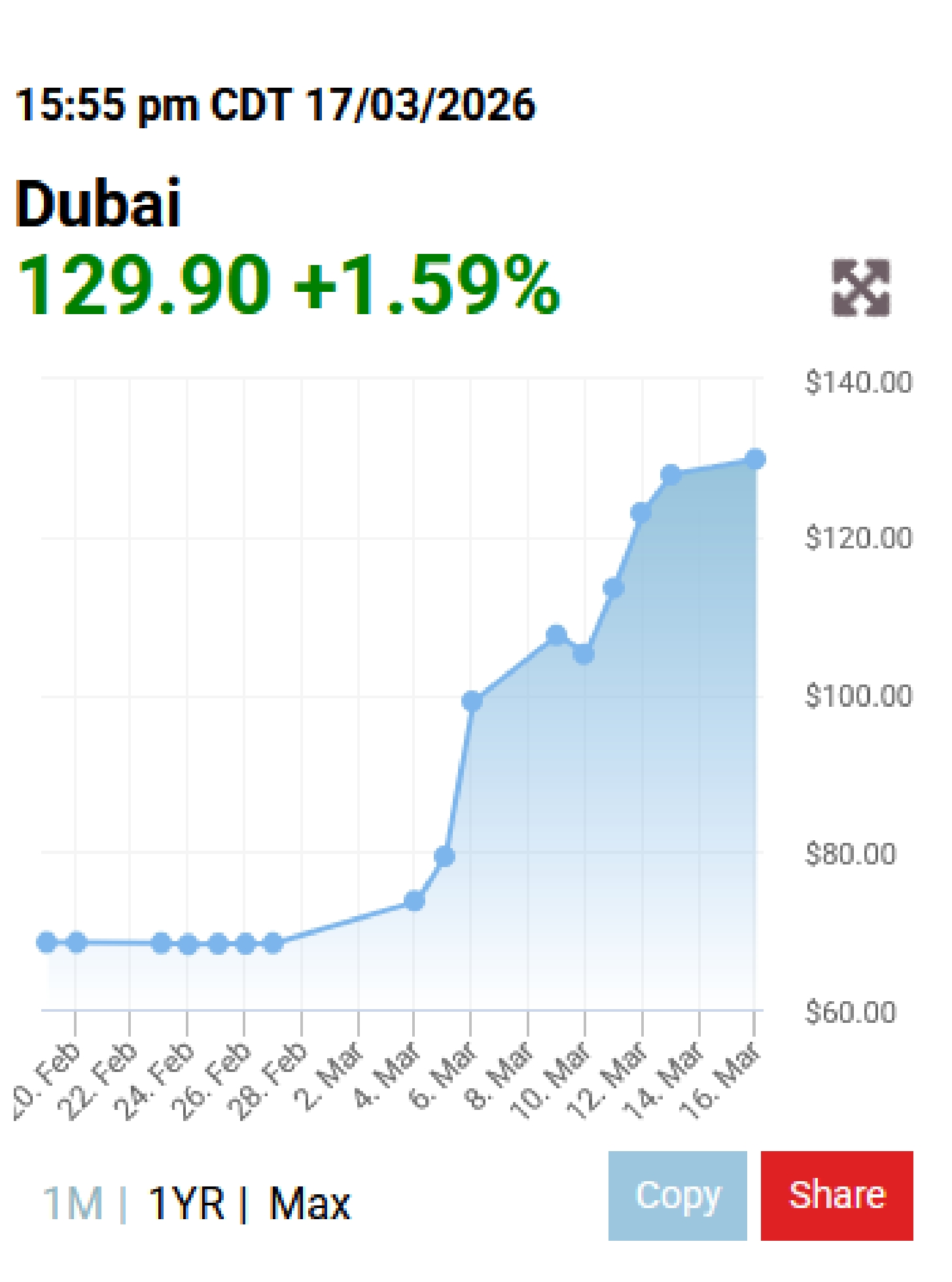 Dubai crude price on March 17, 2026 much higher than the price before the war started on February 28.