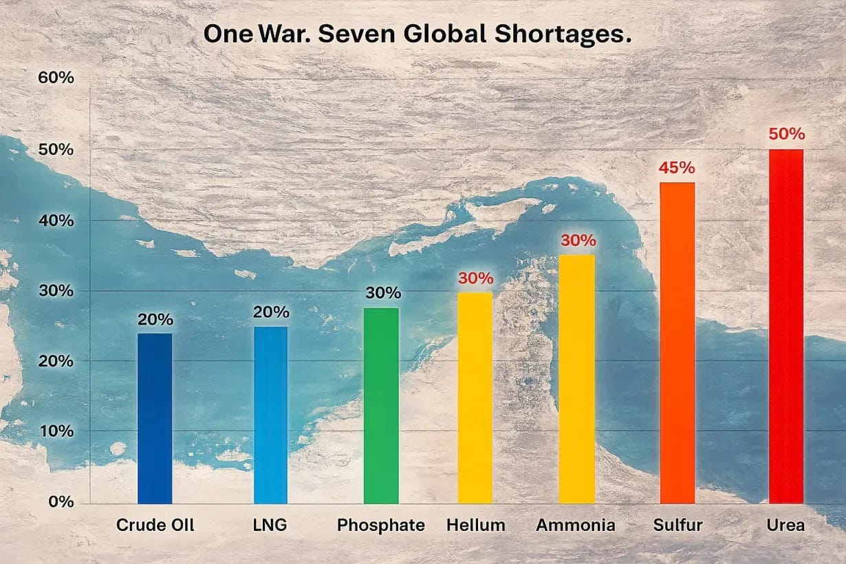 The seven commodities that were cut off by the Strait of Hormuz’s closure. Transport, food production, and tech industry are all terribly affected.